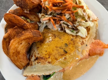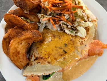 Mushroom, spinach, onion, bell peppers, avocodo pulp & salsa fresca over home potatoes served with toast...$14.25