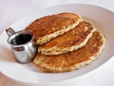 2 stack of pancakes, 2 egg any style with 2 strips of bacon or sausage...$14.95. Substitute french toast or Swedish oatmeal pancake...$1.50